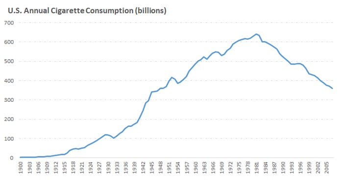 The number of cigarettes smoked in the United States peaked in 1981 at 640 billion. By 2017 it was 249 billion and falling. That equates to 11,574 fewer cigarettes smoked every second.